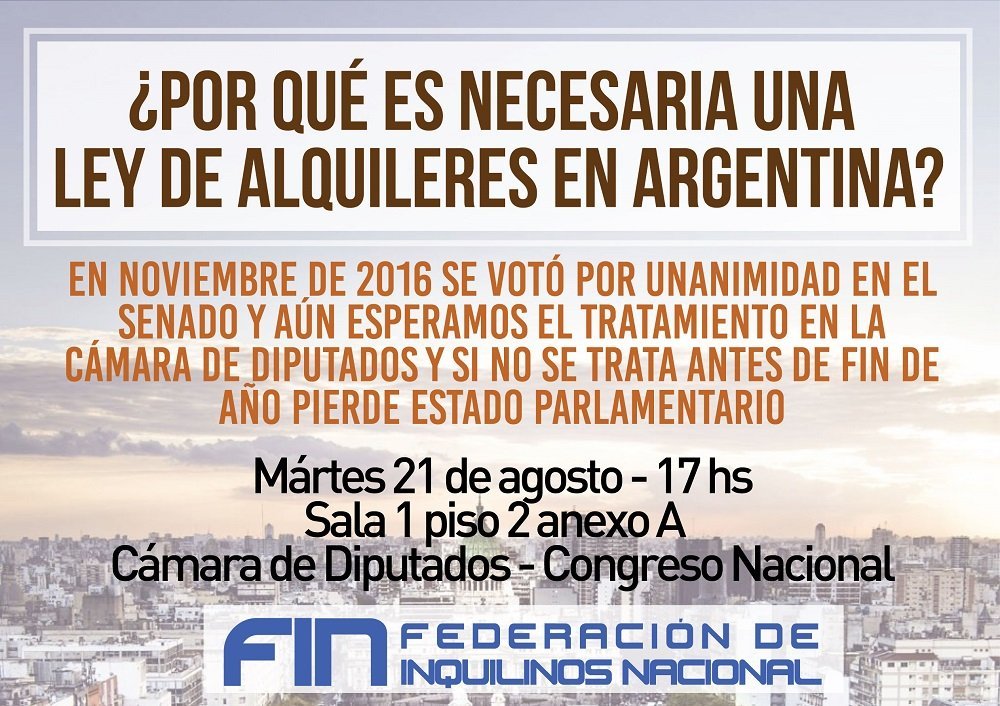 16/08/2018 Desde la Federación de Inquilinos Nacional convocamos a diputados, senadores, dirigentes sociales y sindicales de todo el arco político a mantener un diálogo con las organizaciones de inquilinos de todo el país frente a la necesidad de tratamiento de la ley de alquileres nacional. Será el próximo martes 21 de agosto en el Anexo de la Cámara de Diputados.